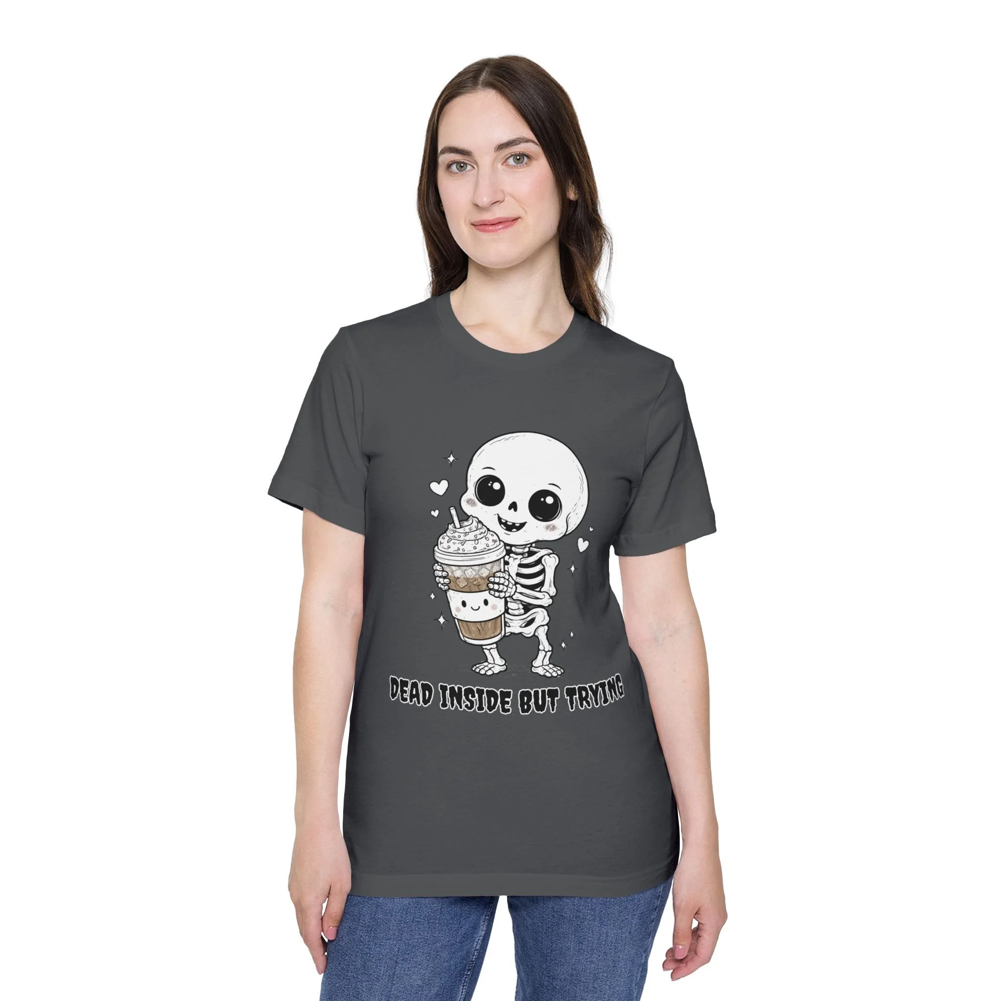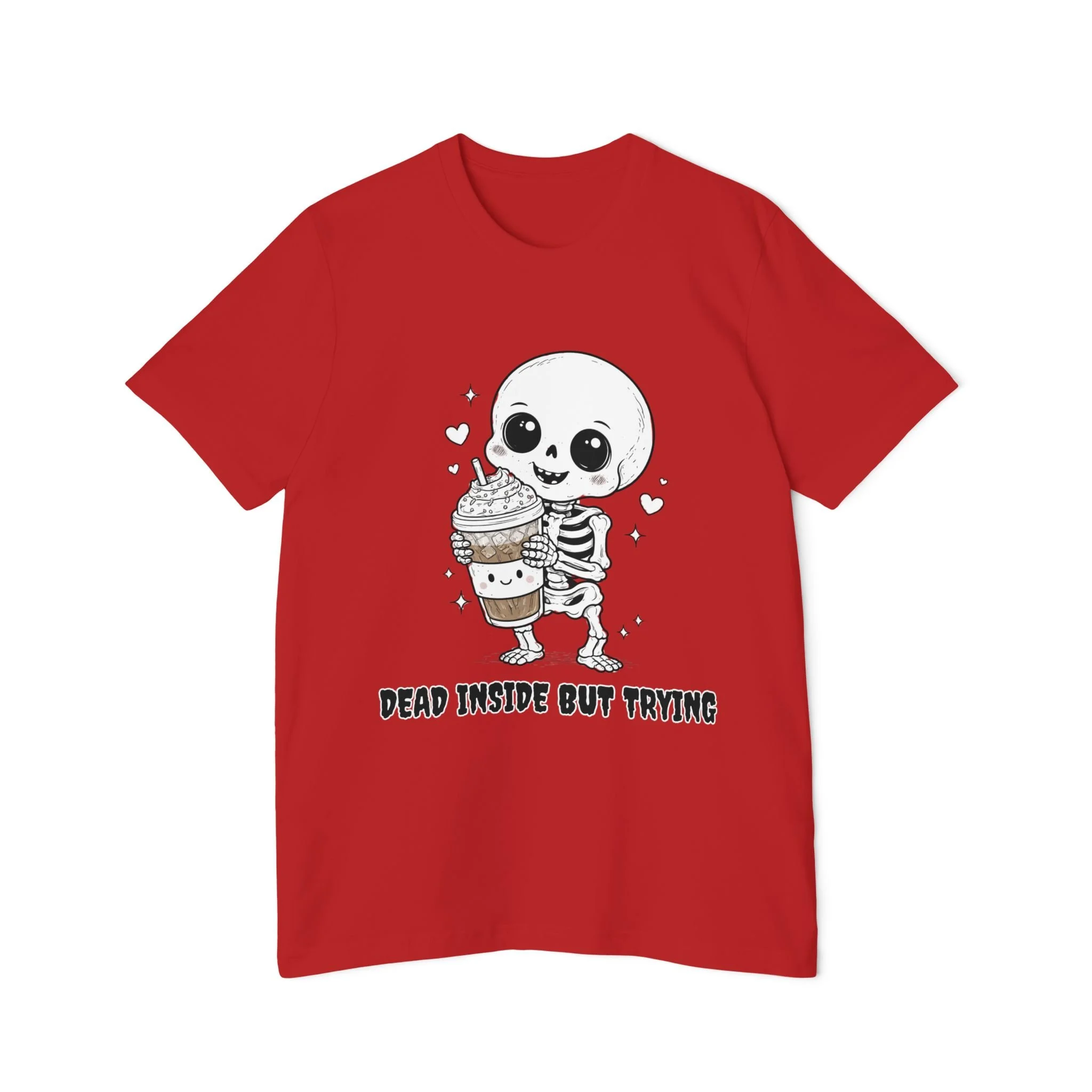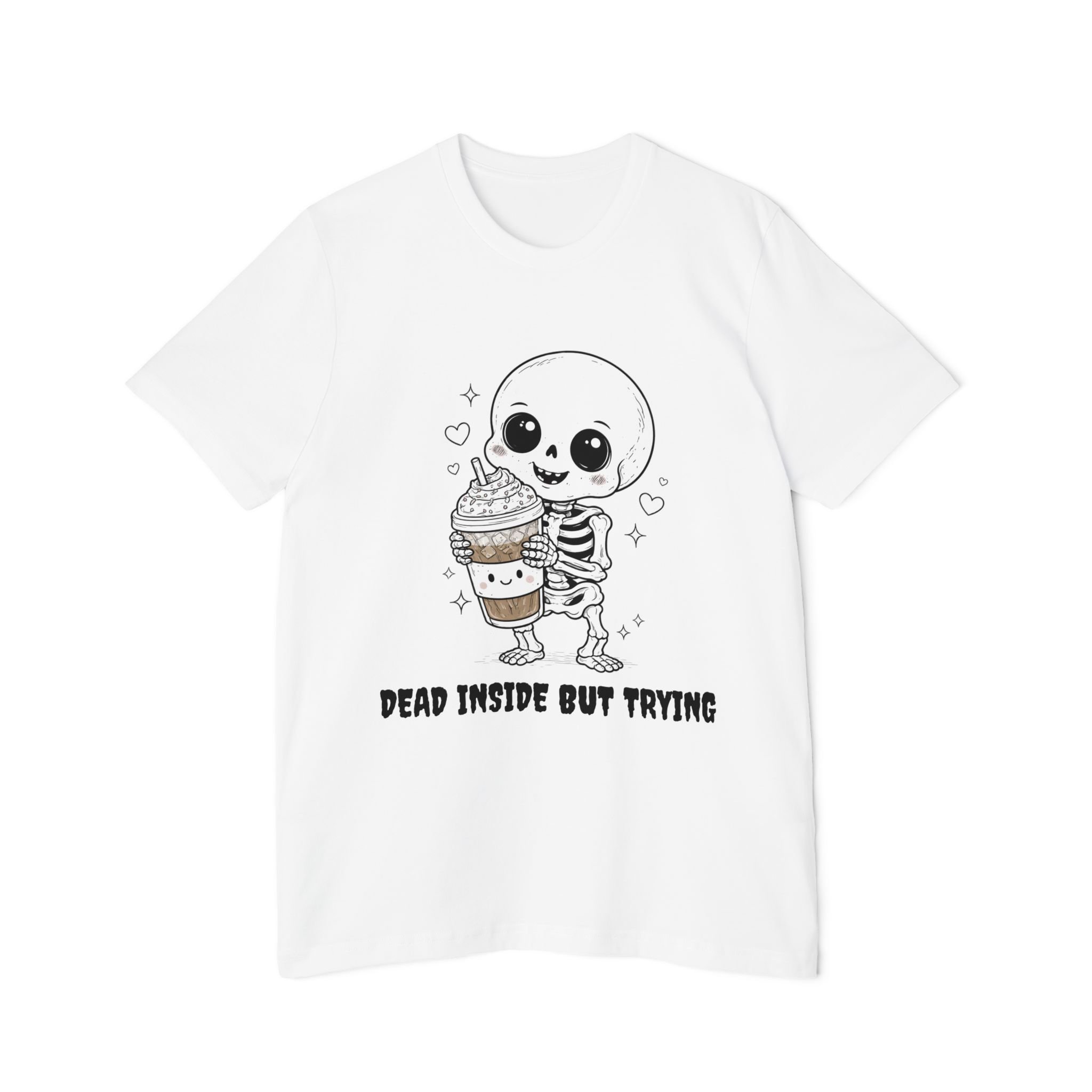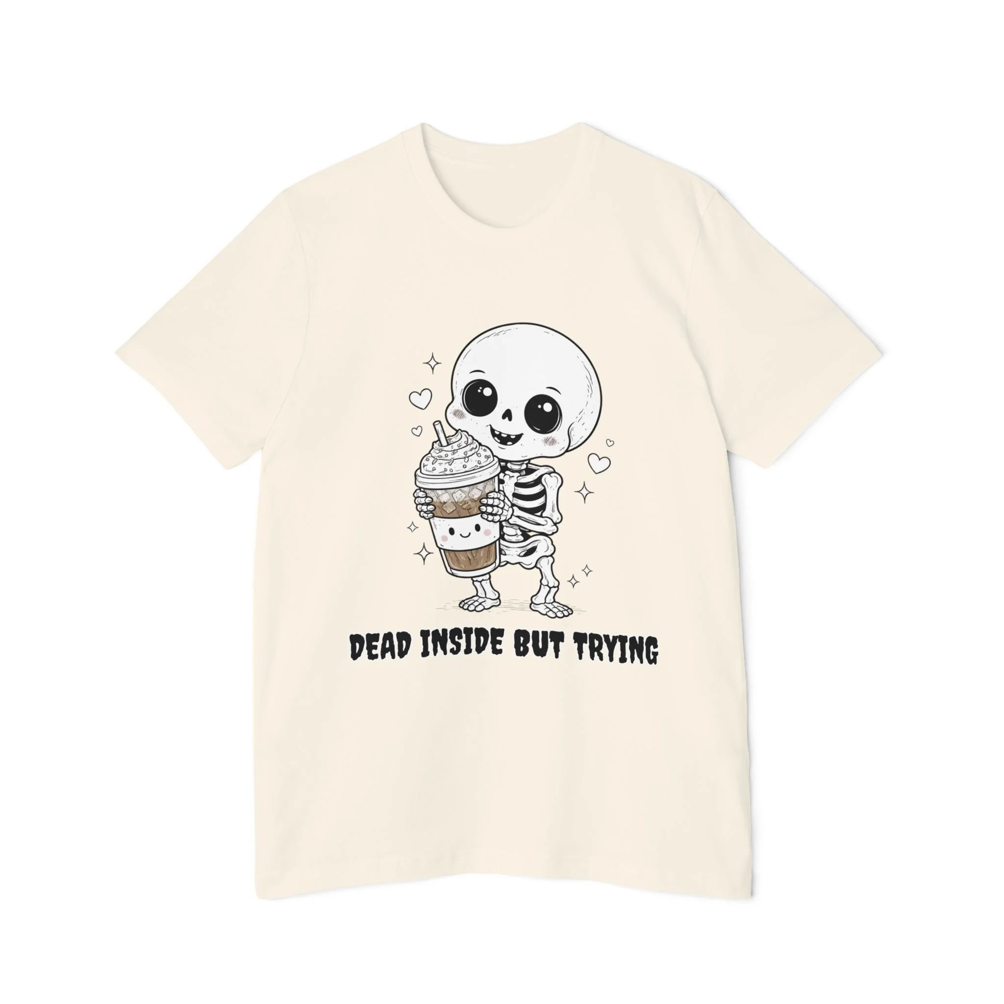 This light, USA-made jersey tee pairs soft, airy fabric with a delightfully dark-humored illustration: a wide-eyed cartoon skeleton clutching a smiling coffee cup, surrounded by tiny hearts and stars, with the caption “Dead Inside But Trying.” It reads like a quiet, honest wink to anyone juggling burnout and small comforts. The retail fit and tear-away label keep the silhouette clean and comfortable, while the thin, breathable cloth layers easily under jackets or stands alone on warmer days. Wear it to morning classes, late-night study sessions, or slow coffee runs — it’s for people who move through life with dry humor, gentle resilience, and a fondness for cute-but-morbid art.