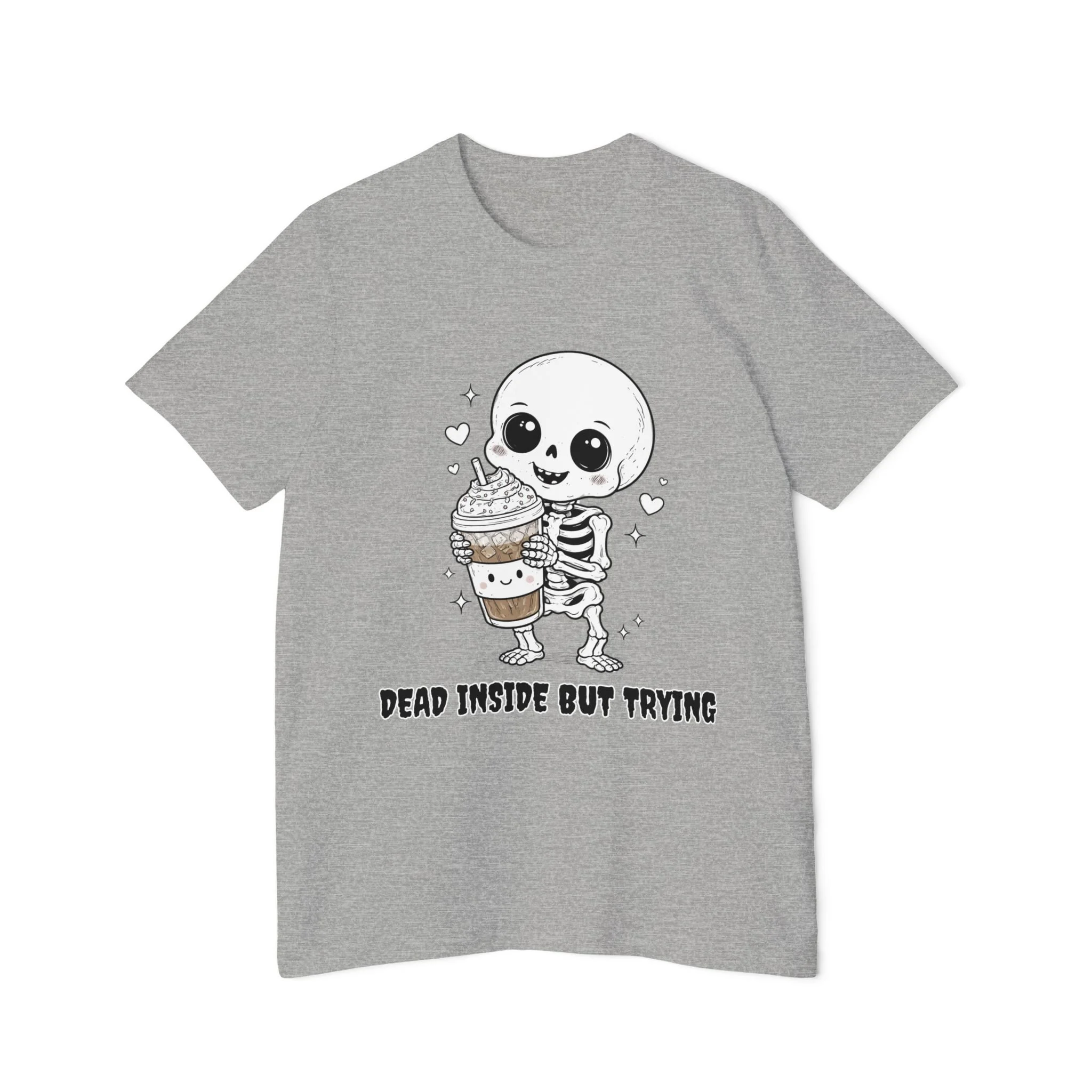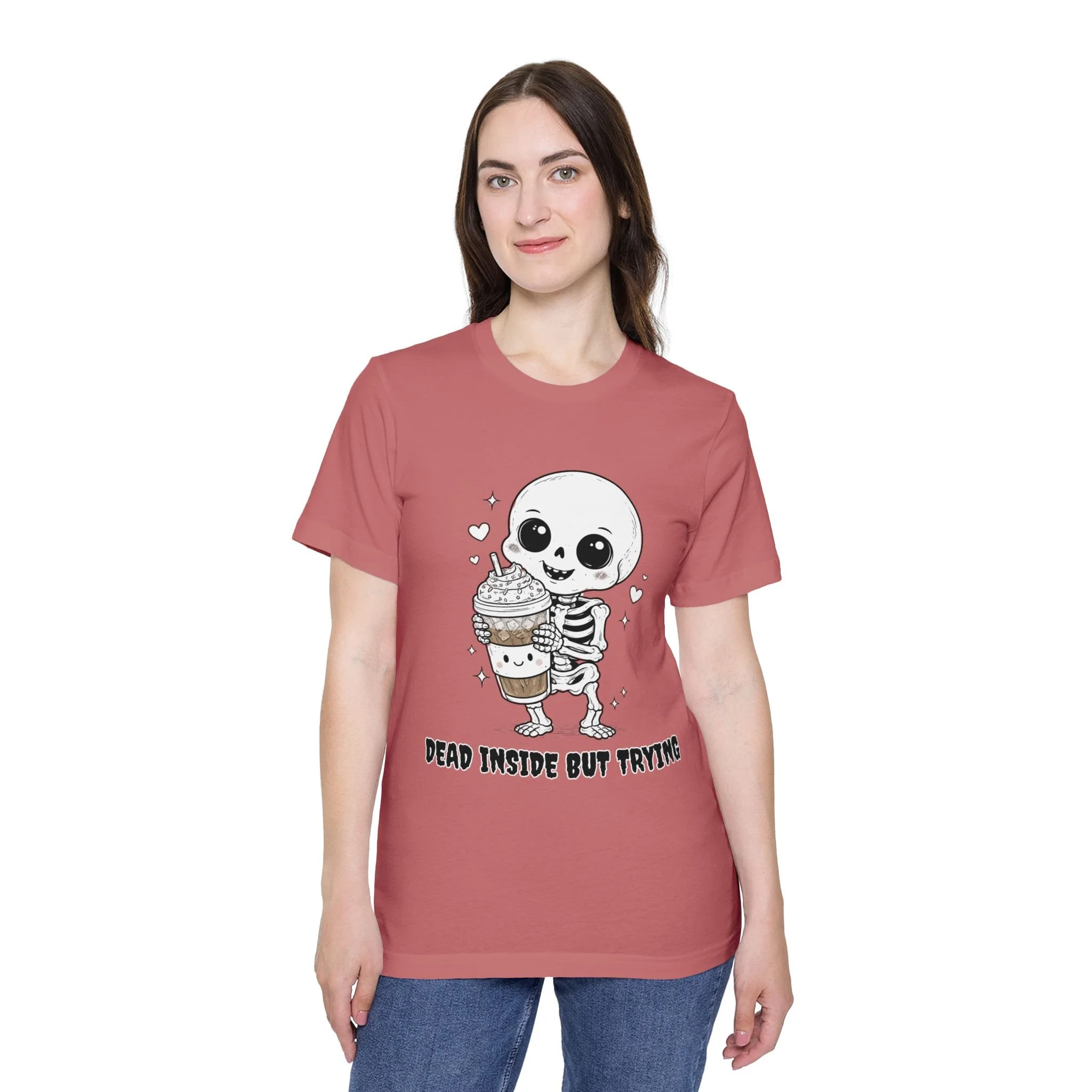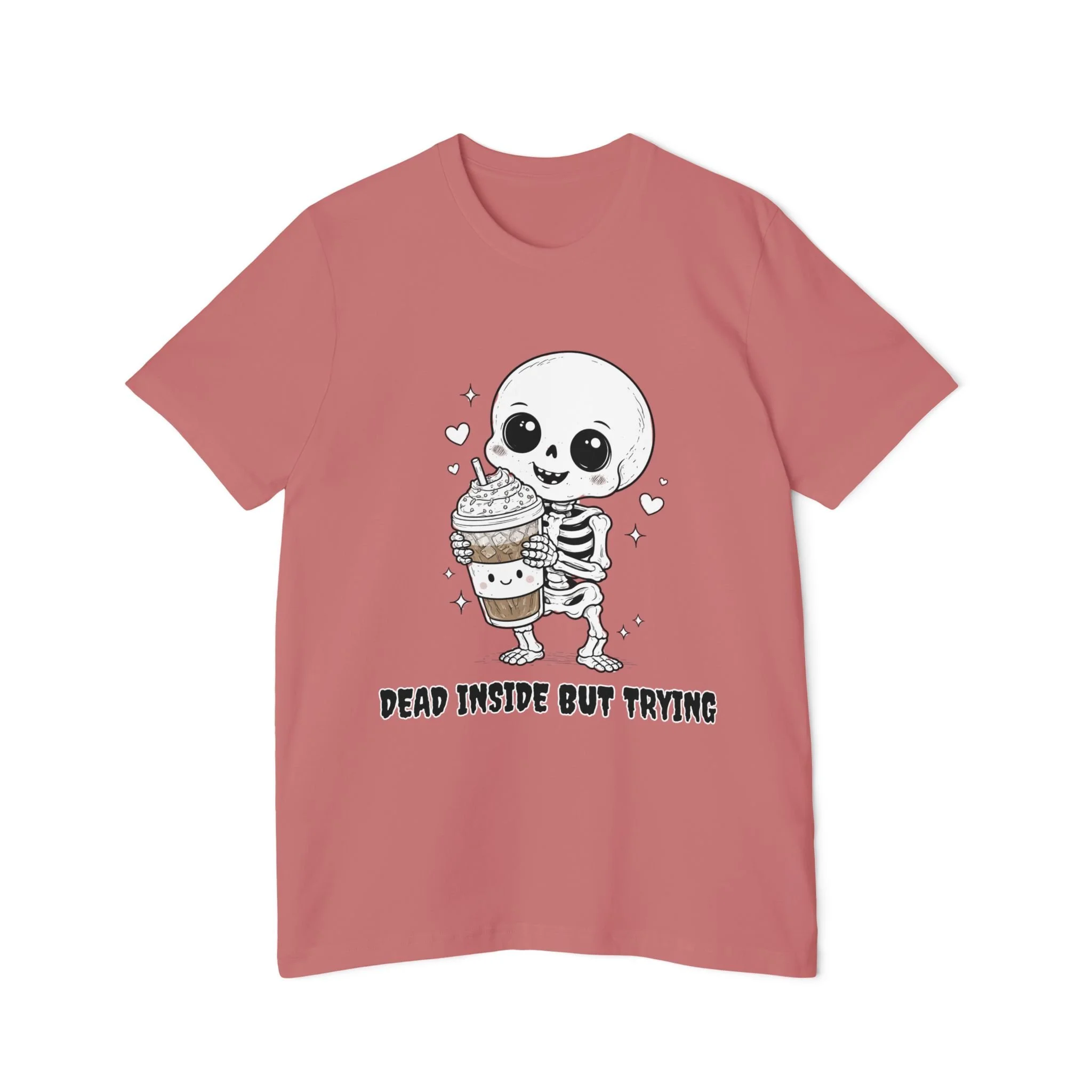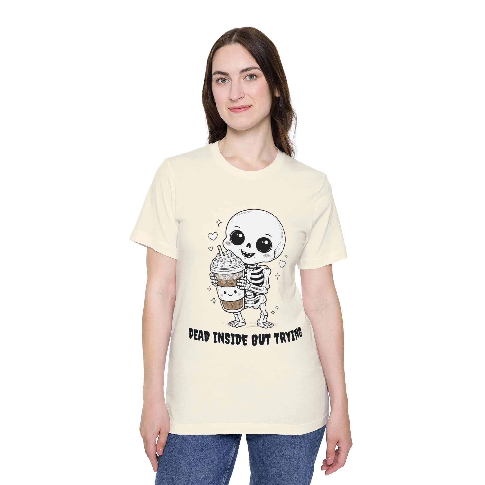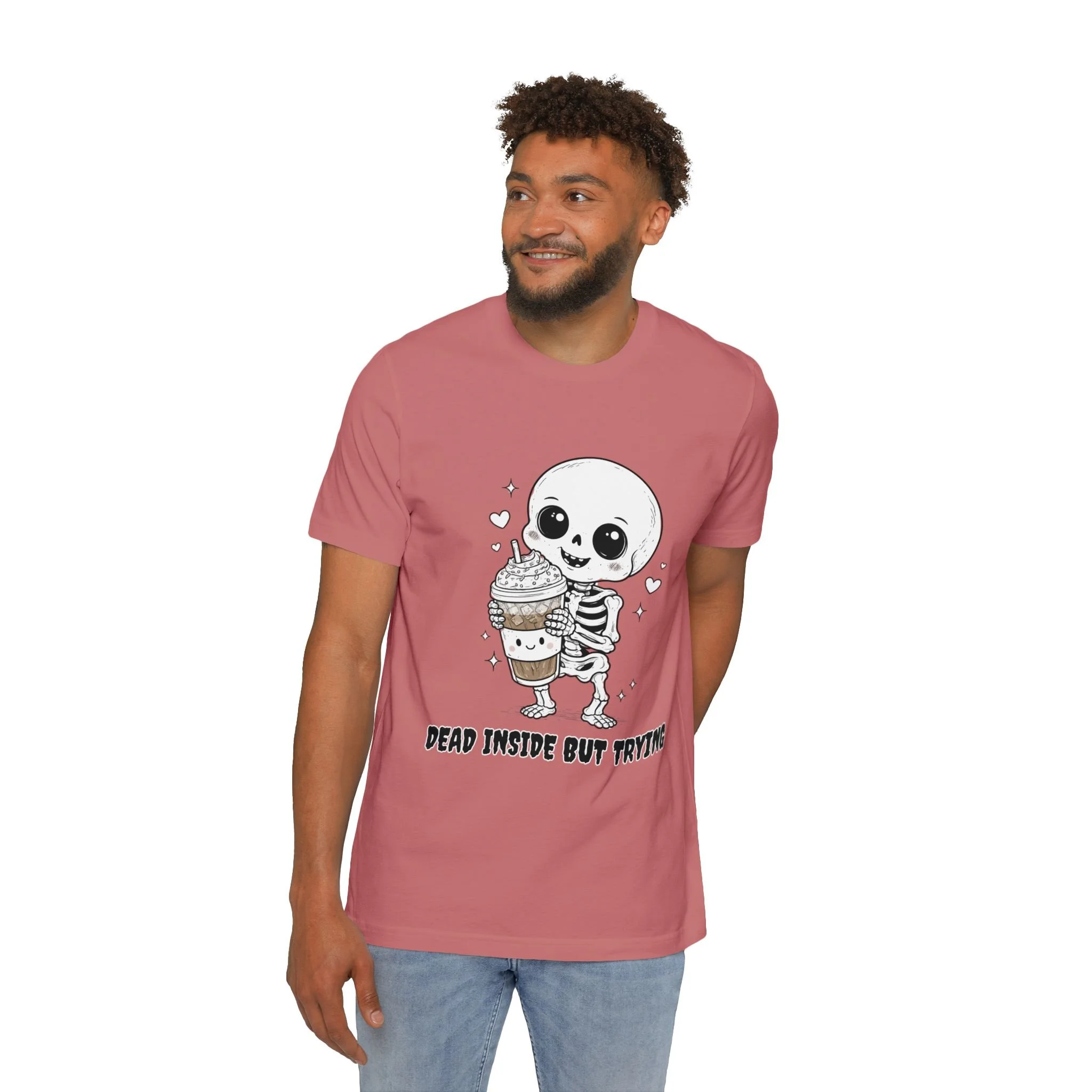 This light, USA-made jersey tee pairs soft, airy fabric with a delightfully dark-humored illustration: a wide-eyed cartoon skeleton clutching a smiling coffee cup, surrounded by tiny hearts and stars, with the caption “Dead Inside But Trying.” It reads like a quiet, honest wink to anyone juggling burnout and small comforts. The retail fit and tear-away label keep the silhouette clean and comfortable, while the thin, breathable cloth layers easily under jackets or stands alone on warmer days. Wear it to morning classes, late-night study sessions, or slow coffee runs — it’s for people who move through life with dry humor, gentle resilience, and a fondness for cute-but-morbid art.