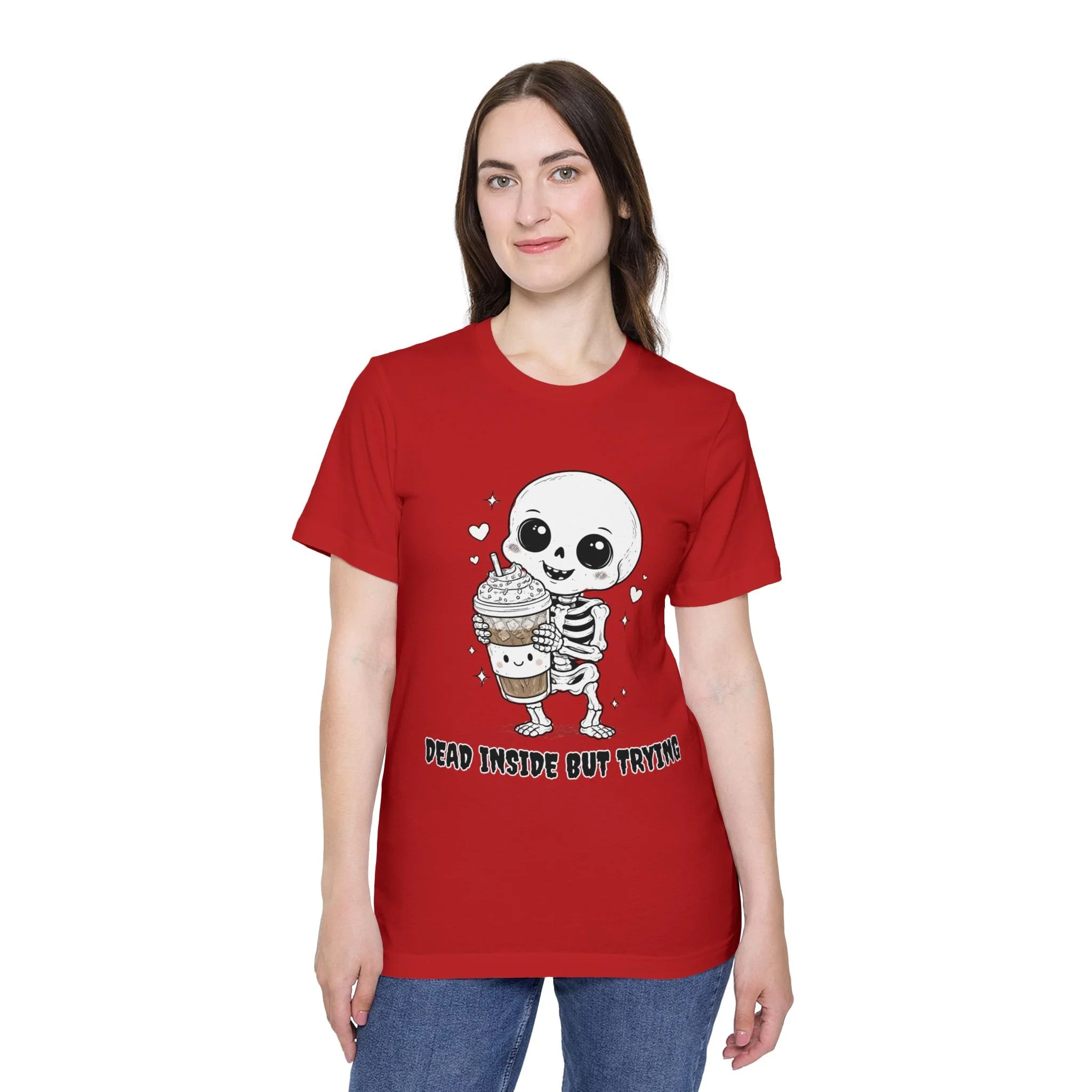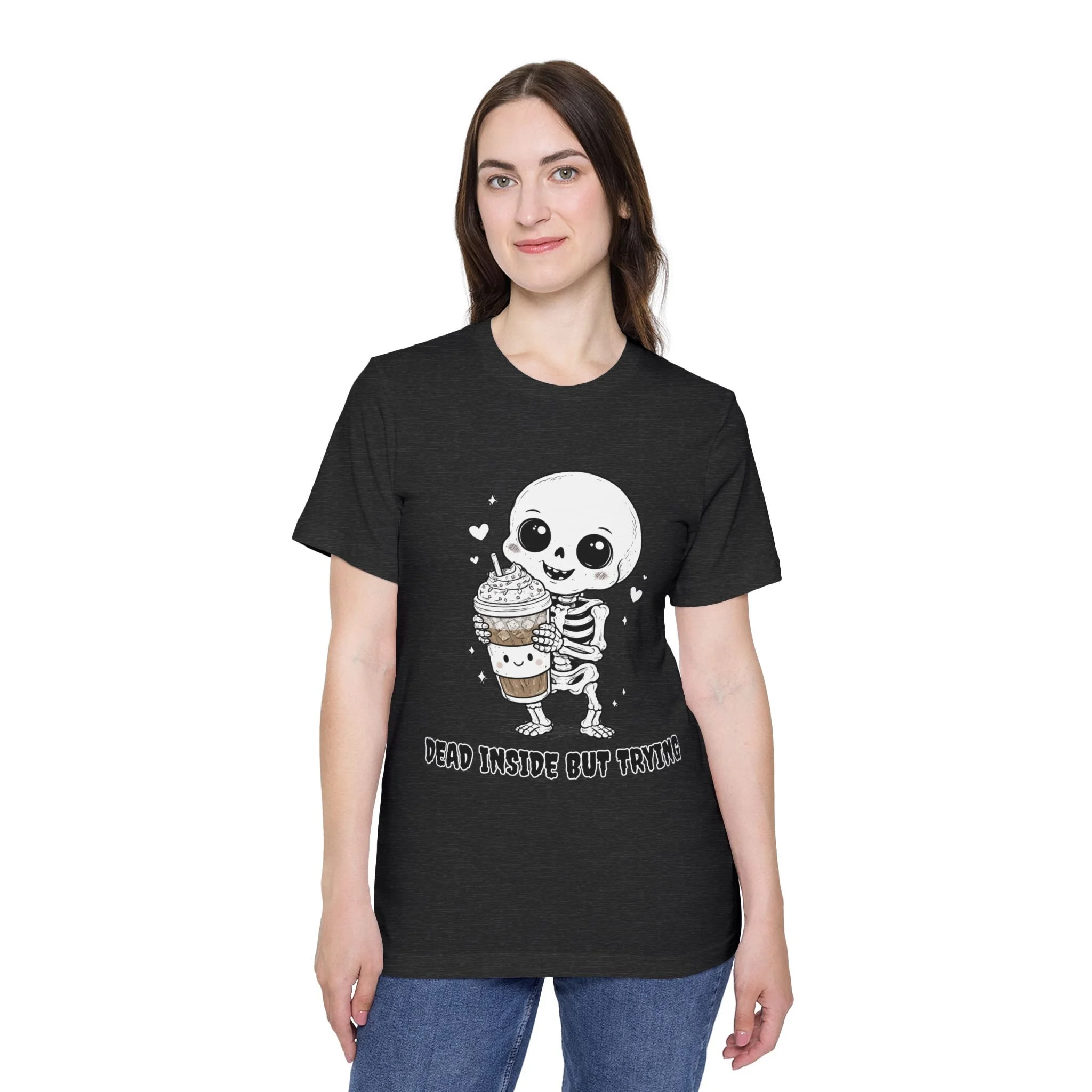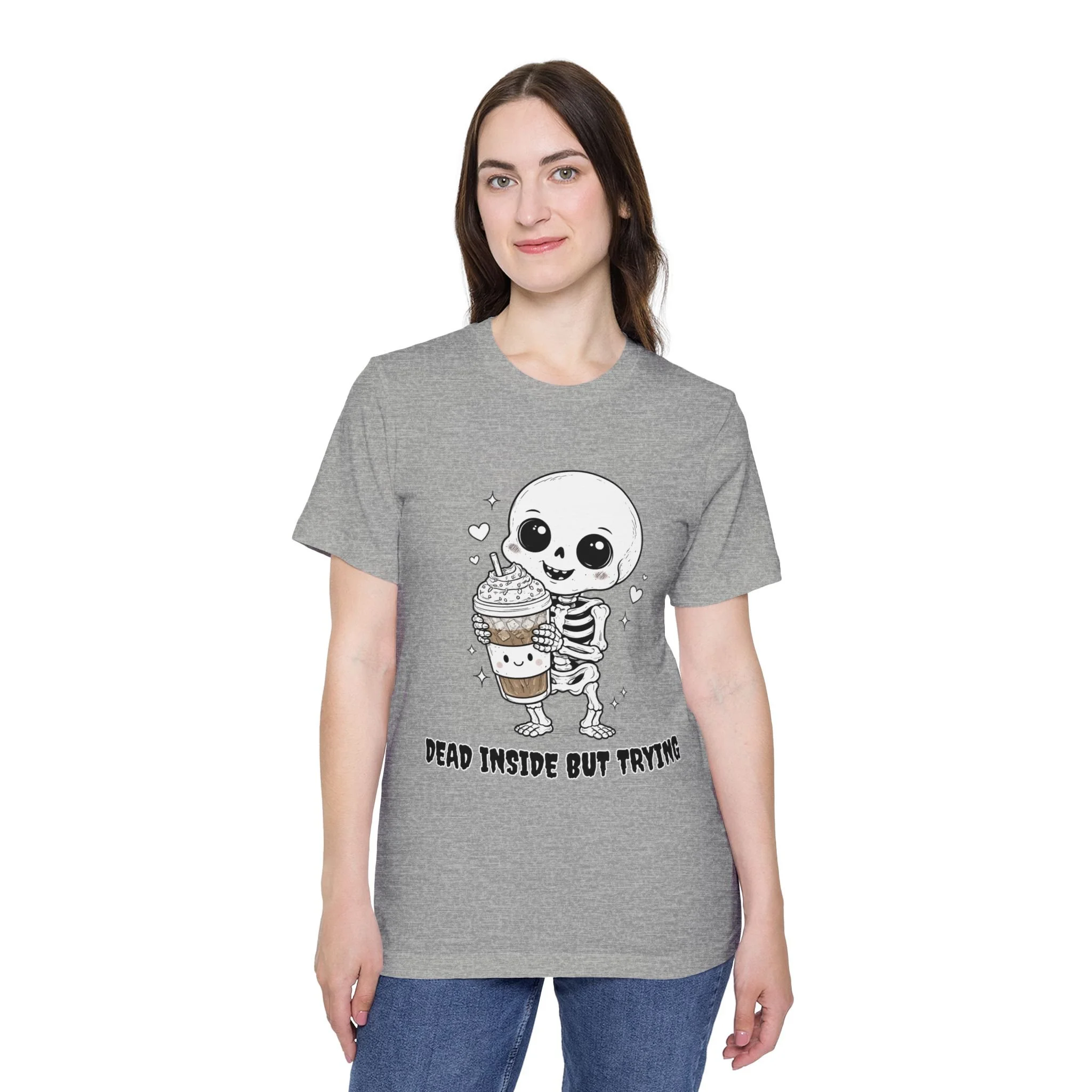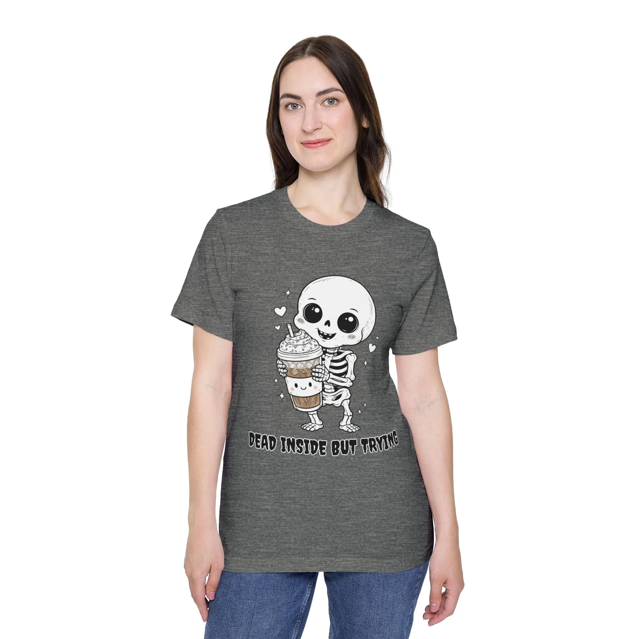 This light, USA-made jersey tee pairs soft, airy fabric with a delightfully dark-humored illustration: a wide-eyed cartoon skeleton clutching a smiling coffee cup, surrounded by tiny hearts and stars, with the caption “Dead Inside But Trying.” It reads like a quiet, honest wink to anyone juggling burnout and small comforts. The retail fit and tear-away label keep the silhouette clean and comfortable, while the thin, breathable cloth layers easily under jackets or stands alone on warmer days. Wear it to morning classes, late-night study sessions, or slow coffee runs — it’s for people who move through life with dry humor, gentle resilience, and a fondness for cute-but-morbid art.