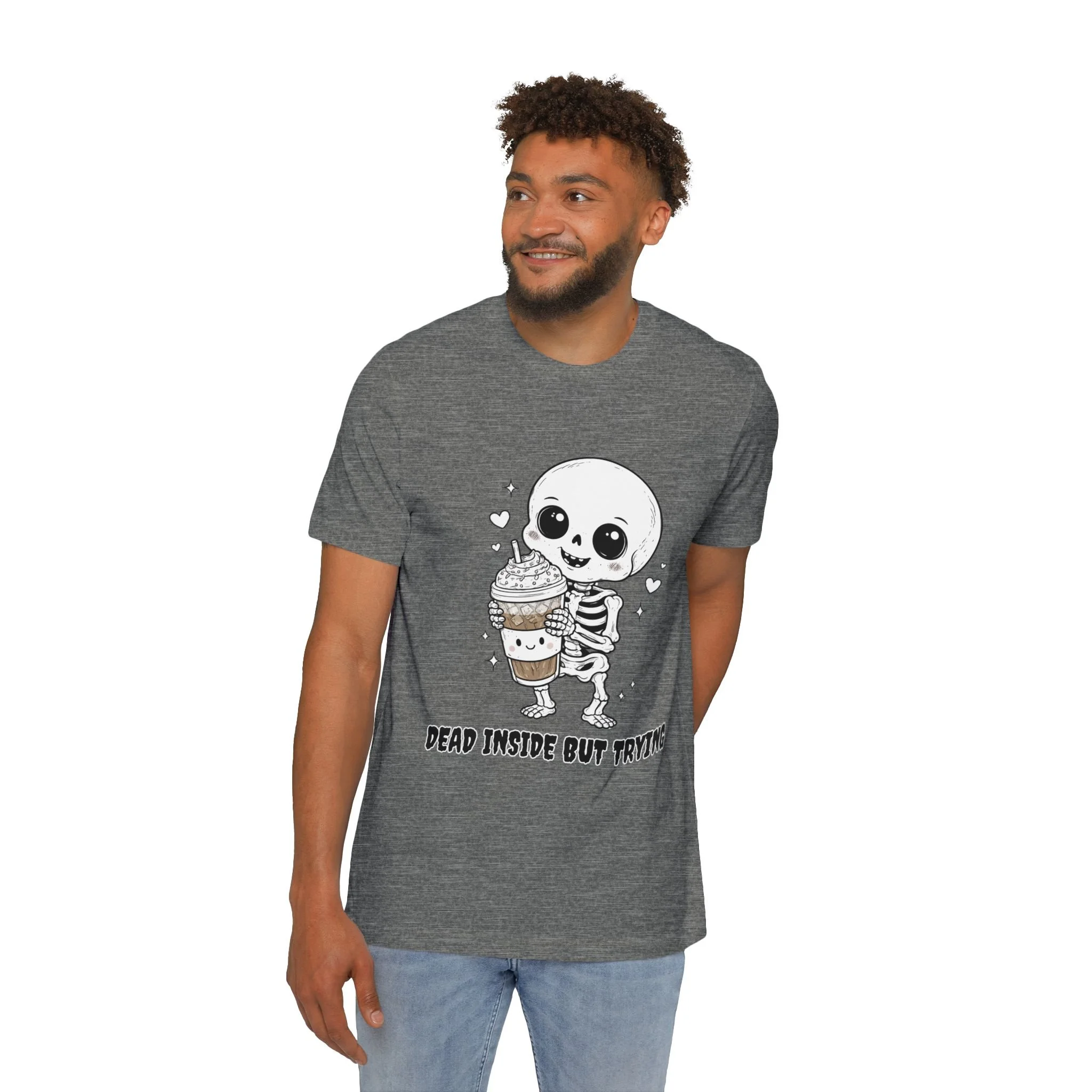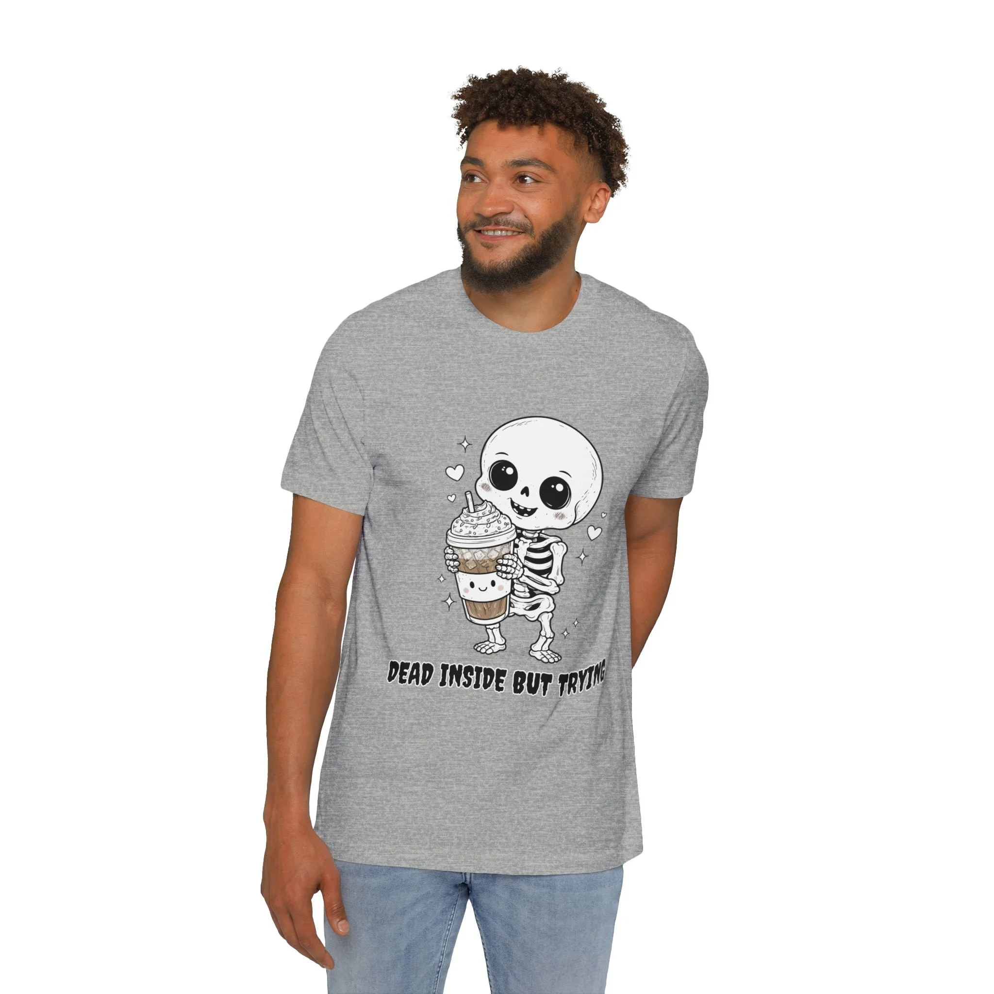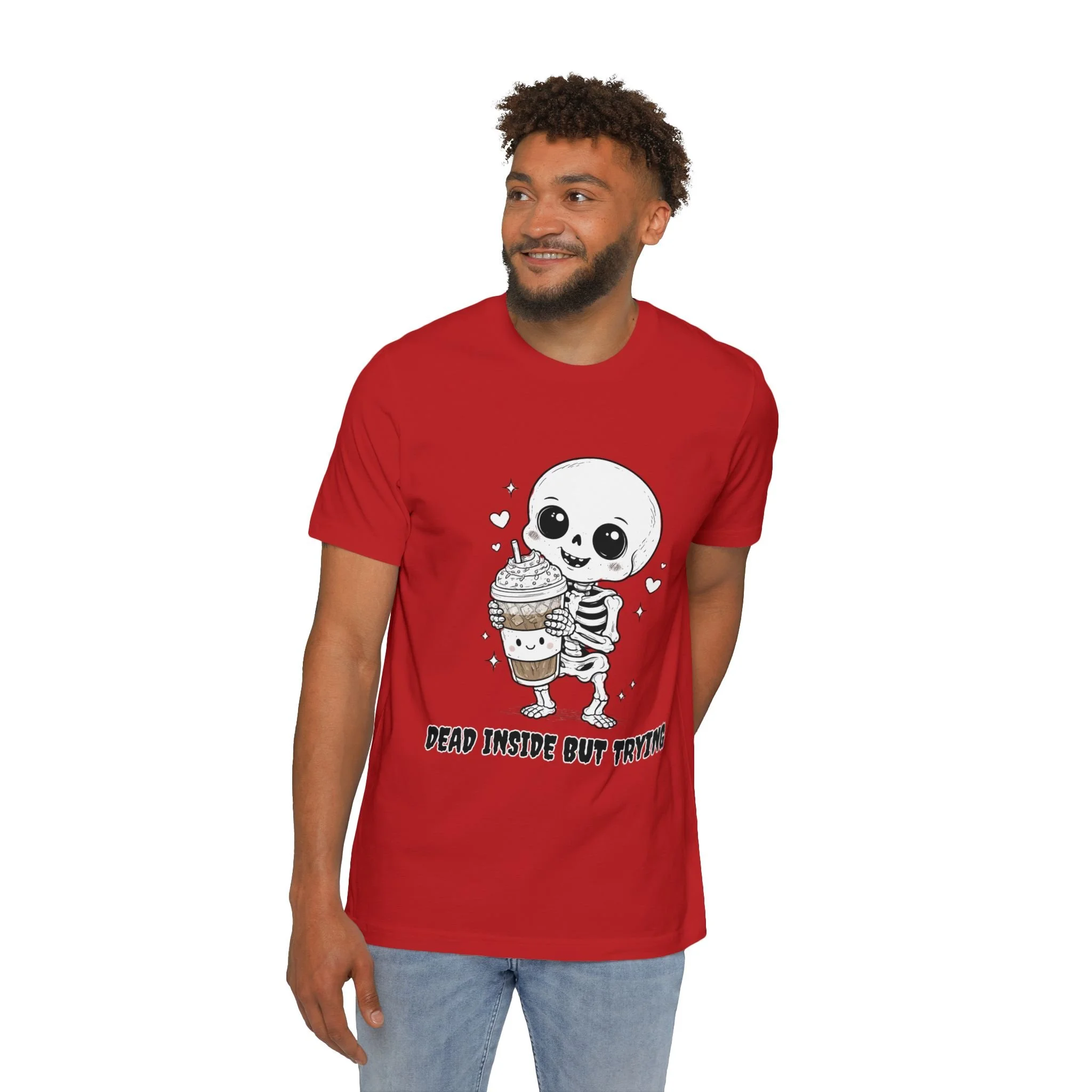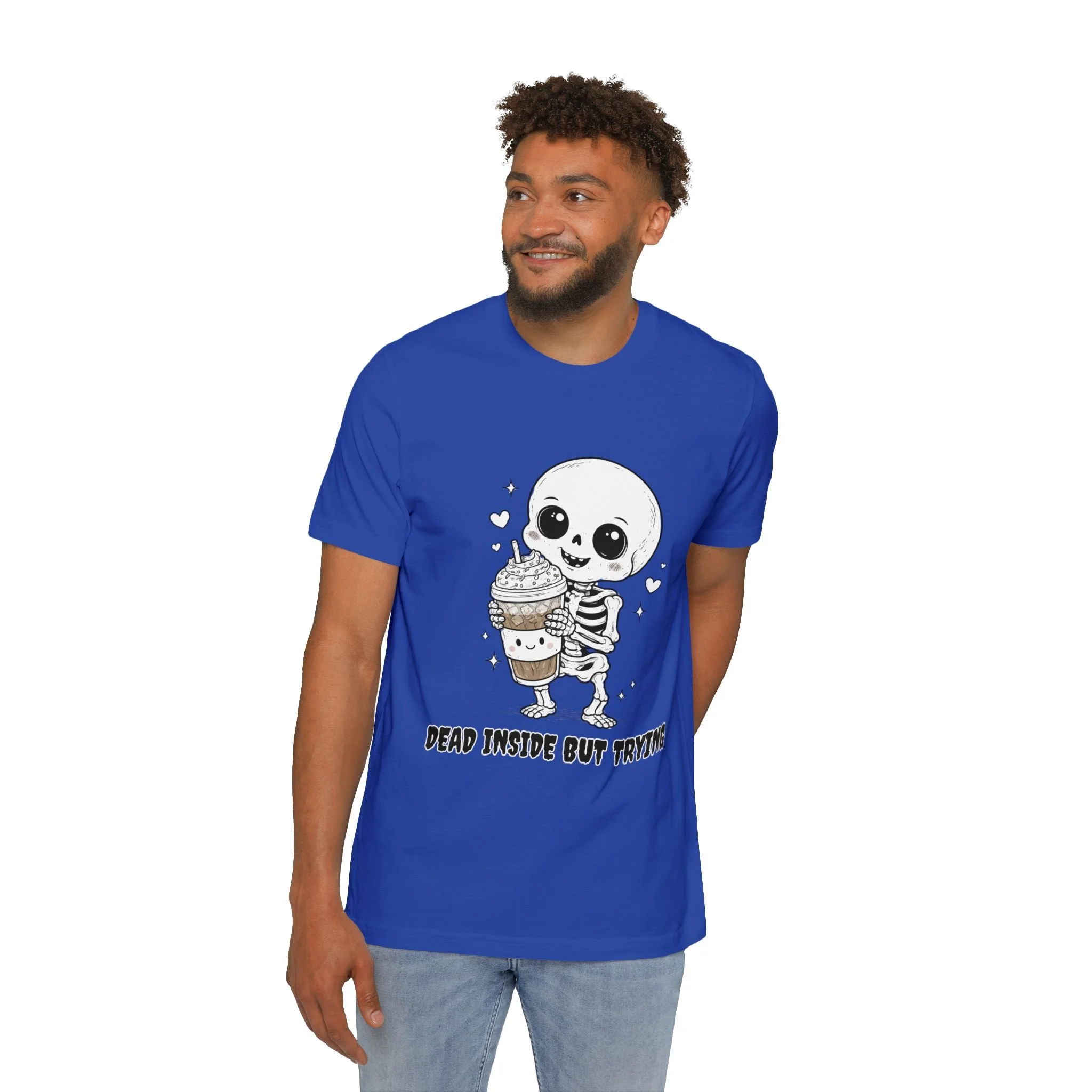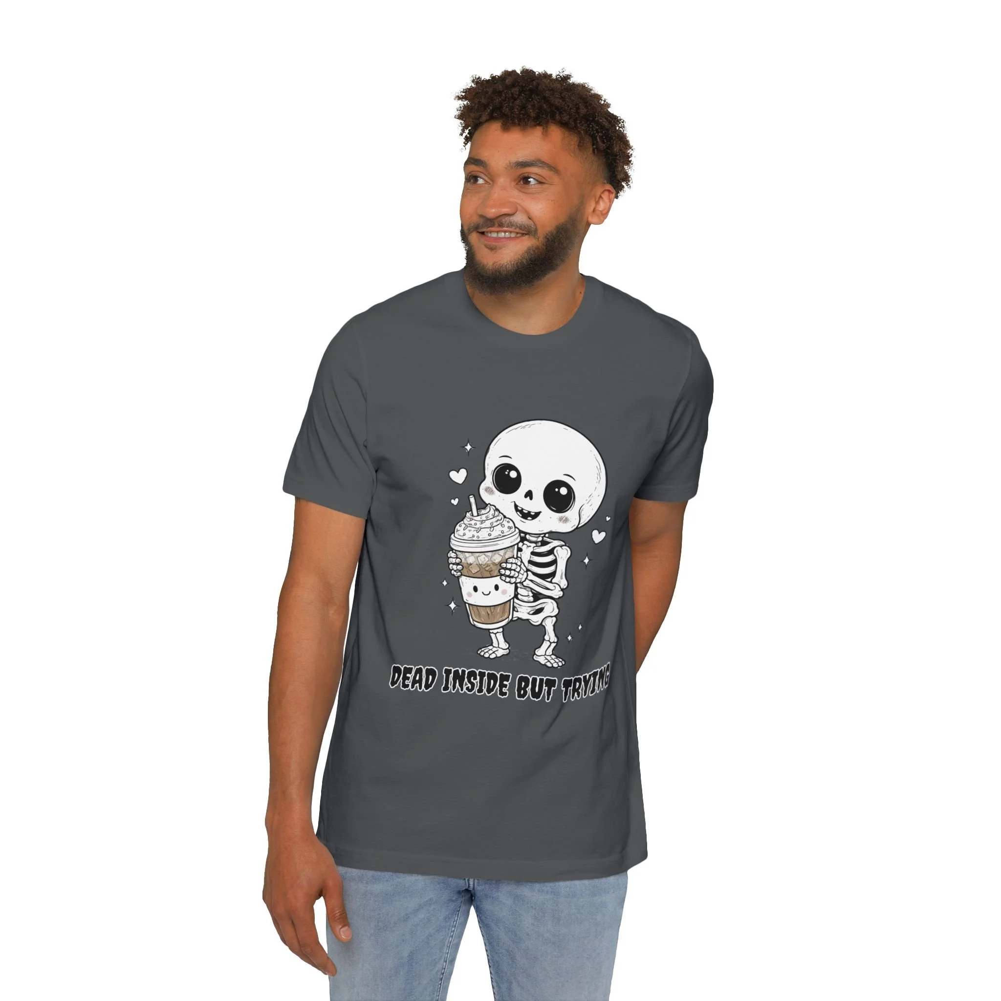 This light, USA-made jersey tee pairs soft, airy fabric with a delightfully dark-humored illustration: a wide-eyed cartoon skeleton clutching a smiling coffee cup, surrounded by tiny hearts and stars, with the caption “Dead Inside But Trying.” It reads like a quiet, honest wink to anyone juggling burnout and small comforts. The retail fit and tear-away label keep the silhouette clean and comfortable, while the thin, breathable cloth layers easily under jackets or stands alone on warmer days. Wear it to morning classes, late-night study sessions, or slow coffee runs — it’s for people who move through life with dry humor, gentle resilience, and a fondness for cute-but-morbid art.